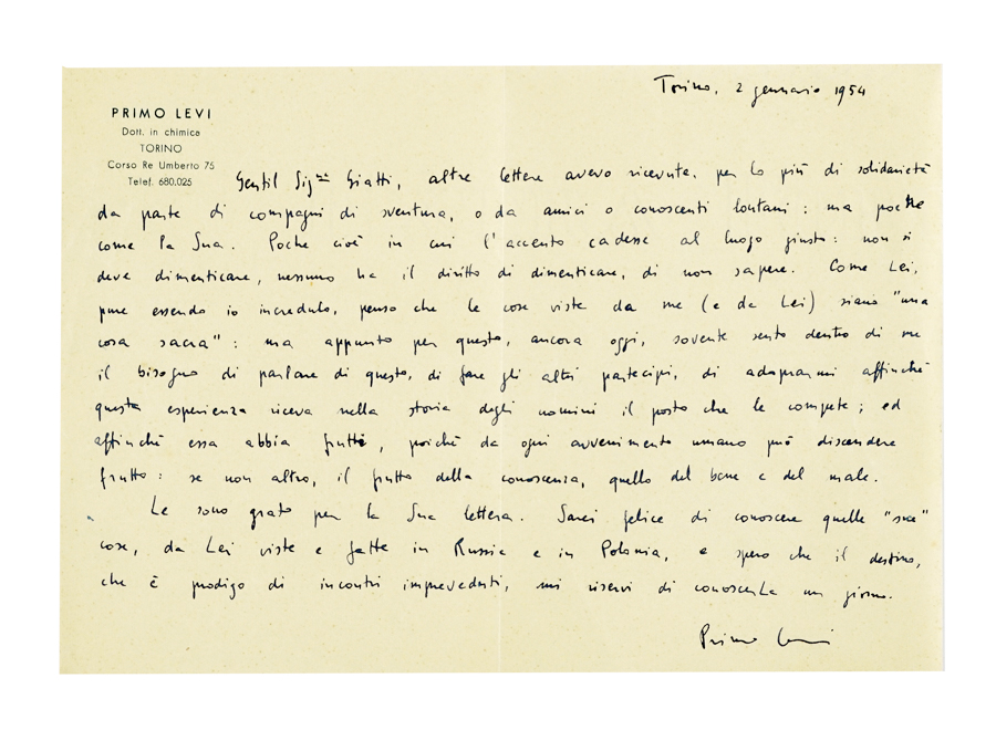 Levi Primo, Lettera autografa firmata, inviata a Nadia Giatti. Datata Torino, 2 gennaio 1954. Manoscritto a inchiostro nero. Una carta oblunga, intestata Primo Levi - Dott. in chimica – Torino – C.so Re Umberto 75. Busta viaggiata conservata: anche l'indirizzo originale è autografo (aggiunto da altra mano: Albergo Italia - Matera). Dimensioni 205x140 mm. (1)Primo Levi scrive: Gentile Sig.na Giatti, altre lettere avevo ricevuto per lo più di solidarietà da parte di compagni di sventura, o da amici o conoscenti lontani: ma poche come la Sua. Poche cioè in cui l'accento cadesse al luogo giusto: non si deve dimenticare, nessuno ha il diritto di dimenticare, di non sapere. Come Lei, pure essendo io incredulo, penso che le cose viste da me (e da Lei) siano una cosa sacra [...] ancora oggi, sovente sento dentro di me il bisogno di parlare di questo, di fare gli altri partecipi, di adoprarmi affinché questa esperienza riceva nella storia degli uomini il posto che le compete [...] poiché da ogni avvenimento umano può discendere un frutto: se non altro, il frutto della conoscenza, quello del bene e del male [...] Primo Levi. Questa lettera, commovente e bellissima, è stata inviata a Nadia Giatti presso l'U.N.R.R.A. - CASAS (acronimi dell'United Nations Relief and Rehabilitation Administration - organizzazione assistenziale americana - e del Centro Autonomo di Soccorso Ai Senzatetto), enti di cui la Giatti era capogruppo e Adriano Olivetti instancabile promotore; a loro si deve anche la riqualificazione dei Sassi di Matera.