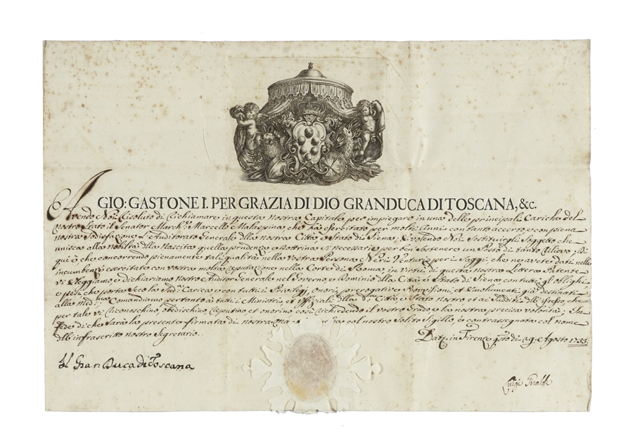 Medici Gian Gastone (de), 2 lettere, una autografa e l'altra con firma autografa. Datate 1699 e l’altra non datata. Manoscritti a inchiostro bruno. Scritte 2 pagine. Dimensioni varie. SI AGGIUNGE: Id: Lettera patente con firma a timbro. Datata 29 agosto 1733. (3)I DOCUMENTO: Gian Gastone de' Medici è stato l'ultimo Granduca di Toscana della dinastia Medici. Regnò dal 1723 al 1737. Lettere di auguri e ringraziamento scritte da Praga e Reichstat. Nella lettera inviata da Reichstat il 3 gennaio s.a. si legge di «[...] robbe stagnate [...] per amor del diaccio ma non m'importa niente non ci avendo niente di premura avendo ancor vino qui [...].».