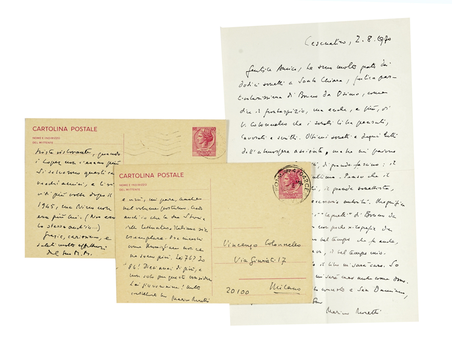 Moretti Marino, 3 cartoline postali e 1 lettera, autografe e firmate, inviate da Cesenatico all'editore Vincenzo Colonnello, Milano. Datate 1970-71. Manoscritti a inchiostro nero. Scritte 7 pagine. Le cartoline sono fittamente compilate al recto e al verso, la lettera solo al recto. Sbavature di inchiostro su una cartolina. Dimensioni varie. (4)Nei testi si trovano riferimenti ai Sonetti a Santa Chiara di Bruno da Osimo, al povero Pastonchi (Francesco Pastonchi, morto nel '53), al mosaico di San Clemente a Roma, all'amico Siciliani, a la poesia di Bruges, il beghinaggio, i giorni di Milano e di Venezia, alla città di Baveno, dove il poeta scrive che passò l'ultimo giorno di guerra, e al suo bel tempo milanese subito dopo l'altra guerra. Un affettuoso ricordo è dedicato ad Attilio Momigliano: «[...] Quanto a Momigliano, non so dirle quanto io lo abbia amato e ammirato, sempre nel mio bel tempo fiorentino [...] Credo anch'io che la sua Storia della letteratura italiana sia esemplare. Ora maestri come Momigliano non ce ne sono più [...].».