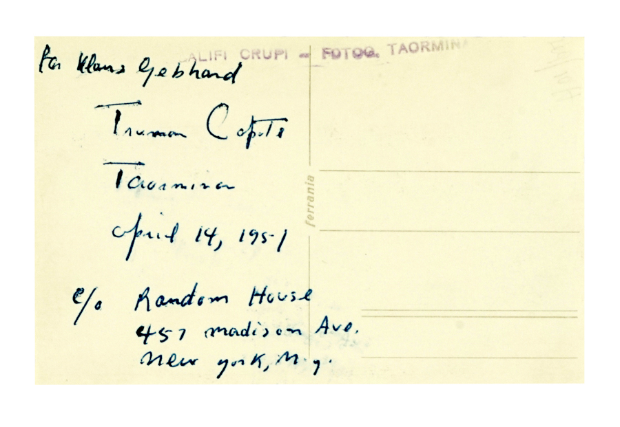 Truman Capote Truman Capote, Fotocartolina con annotazione e firma autografa. Datata 14 aprile 1951, Taormina. Manoscritto a inchiostro blu. Al verso il timbro Galifi Crupi – Fotog. Taormina. Dimensioni: 90x140 mm. (1)Truman Capote si trasferì a Taormina, cittadina di cui si innamora, nell'aprile del 1950. Prese dimora a Fontana Vecchia, a quel tempo nelle campagne sopra Taormina. In questa fotocartolina non viaggiata Capote scrive: For Klaus Gebhard / Truman Capote / Taormina / April 14, 1951 / c/o Random House / 451 Madison Ave. / New York [...].