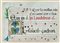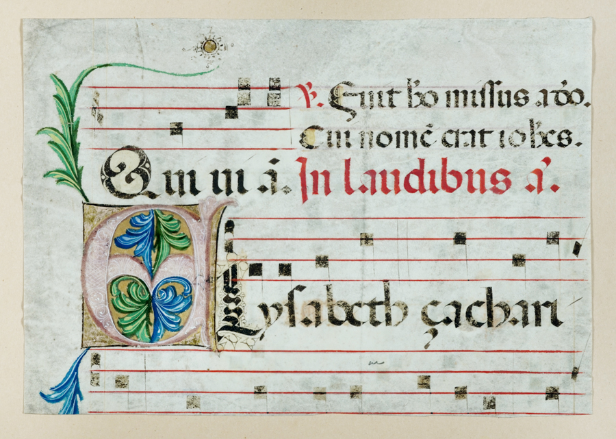 Iniziale E miniata. Fine XV-inizio XVI secolo. Parziale foglio di antifonario pergamenaceo (mm 212x300) con iniziale E (Elisabeth zachari) miniata. Rubr. In laudibus a[ntiphona]. Tempera (blu, verde, rosa e bianco) e oro su pergamena. Scrittura gotica con notazione musicale quadrata su tetragramma. Fregi foliati e un piccolo sole che si sviluppano dall'iniziale al margine esterno e superiore dello specchio di scrittura. Foglio applicato, per pochi centimetri, con scotch di carta a supporto cartaceo moderno (mm 320x410). (1)