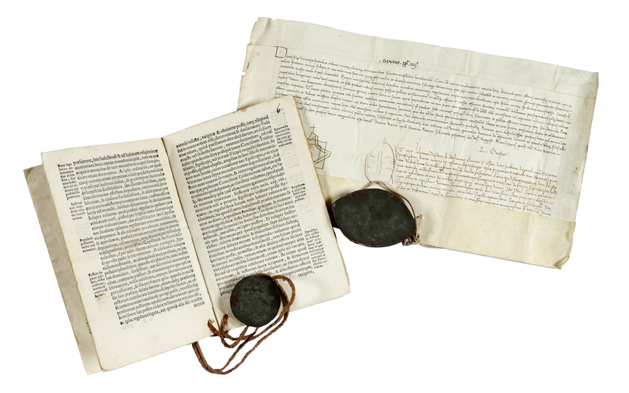 Raccolta di 9 tra bolle papali, brevi, decreti ecc. Datati 1473-1567. Manoscritti pergamenacei e cartacei a inchiostro bruno. 2 documenti a stampa con annotazioni manoscritte (scritture cancelleresche). Alcuni spaghi e sigilli conservati. Dimensioni varie. (9)La raccolta comprende: 1 copia pergamenacea di breve di papa Sisto IV, autenticata dal notaio Luca Raimenti, relativa ai frati e le suore del Terzo Ordine Francescano e il fisco (pagamento di gabelle). Spago conservato. Datata 1473 - 1 copia pergamenacea di breve di papa Sisto IV, autenticata dal notaio Paolo Albertini di Ferrara, diretta al Vicario Generale dell'Ordine dei Minori Osservanti relativa a privilegi e indulgenze. Sigillo ovale in ceralacca con base di cera e spago parzialmente conservato. Datata 19 dicembre 1480 – Breve pergamenacea di papa Sisto IV (copia autenticata dal notaio Giovanni Desiderio) diretta ai Frati dell'Ordine dei Minori. Conservato il sigillo ovale in teca di zinco e spago originale. Datata 22 febbraio 1482 - Raccolta a stampa di lettere pastorali di Clemente VII e Leone X relative alla Fabbrica di San Pietro (dal 1514 al 1531) con legatura in vacchetta - 1 bolla a stampa di papa Leone X che contiene la concessione dell'indulgenza plenaria per la Fabbrica di S. Pietro che doveva essere riedificata e ampliata (per cui si dovevano sostenere gravi spese). L'indulgenza venne estesa a coloro che si sarebbero recati a visitare la basilica dall'Italia, Gerusalemme, Dalmazia, Bosina, Corsica, Rodi, Austria, Boemia ecc. e nomina Cristoforo da Forlì per la raccolta delle offerte. Sigillo rotondo in ceralacca conservato in teca lignea legato ai fogli con spago originale. Datata 1517 - 1 esenzione dal pagamento delle decime in favore delle monache dell'Ordine dell'Osservanza a causa della povertà dei loro conventi da parte del vescovo di Segni. Conservato il sigillo ovale pendente in ceralacca in teca di zinco (parzialmente conservata) e legato con spago originale. Datata 27 giugno1542 - 1 copia pergamenacea autentica del notaio Vittore Maffei di un decreto dell'imperatore Carlo V relativo ad una supplica (trascritta) dei Frati Francescani dell'Osservanza della Dalmazia afferente alle incursioni dei Turchi e alle difficoltà che ne seguivano. Conservato il sigillo rotondo pendente in ceralacca in teca di zinco e legato con spago originale. Datata 1563 - 1 bolla a stampa di papa Pio V relativa alla confermazione della nuova concessione di privilegi a favore di tutti gli Ordini Mendicanti (Roma, presso gli eredi di Antonio Bladi 1567) con copertina ricavato da un foglio pergamenaceo di un codice giuridico del XIV secolo. Sigillo rotondo pendente in ceralacca conservato in teca di zinco e legato con spago originale alla carta e alla copertina.