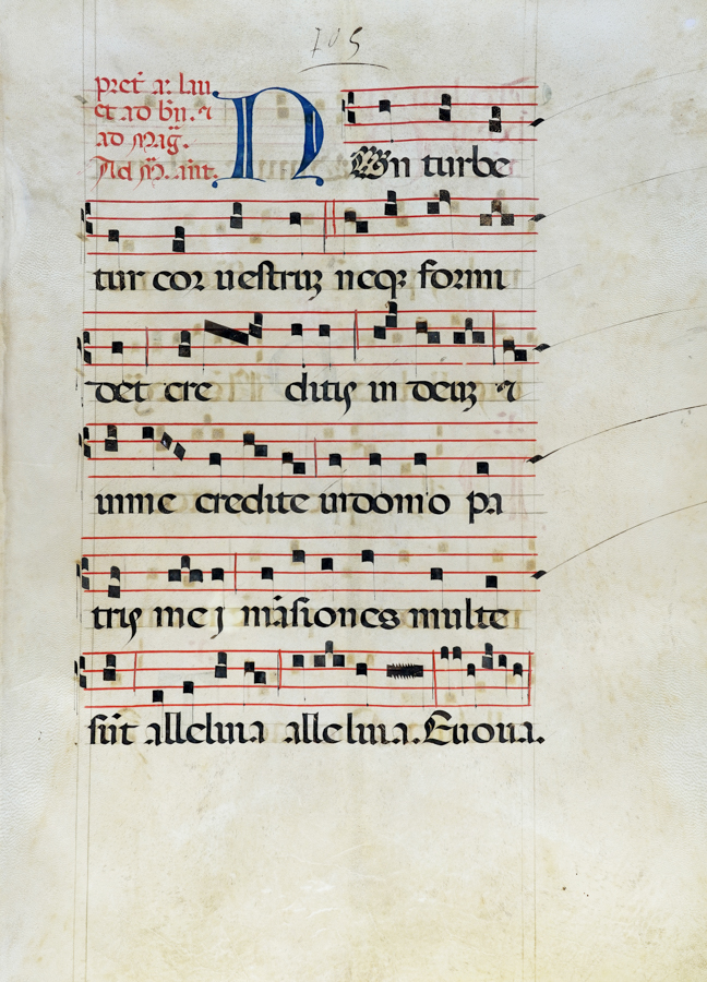 10 fogli pergamenacei con notazione musicale. XVI secolo circa. Manoscritti a inchiostro nero e rosso. 10 fogli (scritti recto e verso). Notazione musicale su tetragramma. 25 capilettera decorati a inchiostro blu e rosso. Scrittura gotica. Fogli provenienti da antifonario. Dimensioni: 530x400 mm. (10)