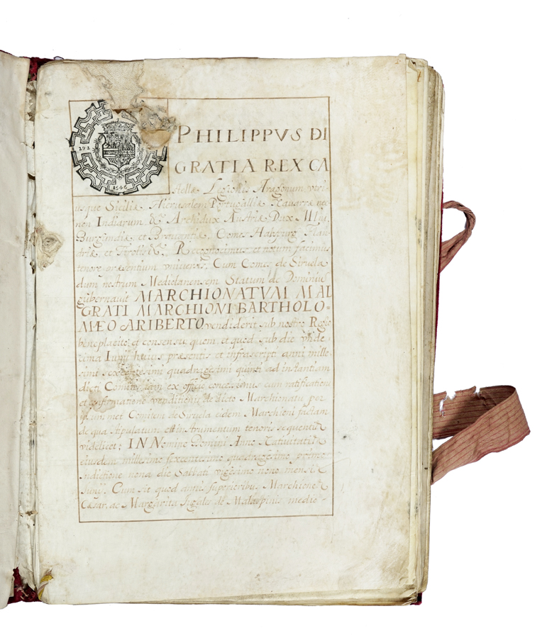 Conferma dell'Instrumento del Marchesato di Malgrate in Lunigiana conferito dal re di Spagna Filippo IV (con sua firma) a Bartolomeo Ariberti. Datato dicembre 1645. Manoscritto a inchiostro bruno. Fogli 42 (l'ultimo bianco). Una piccola mancanza in testa al primo foglio e un piccolo risarcimento in testa ai fogli 2-5 (senza perdita di testo). Testo in latino, italiano e spagnolo. In fine si legge: Confirma [...] del Instrumento del Marquesado de Malgrado, hecha por el Conte de Sirvela el ano de 1642 que governava el Estado de Milan al Marq. Bar.me Ariberti. Legatura antica in velluto rosso scuro con lacci rosa in seta. Grande sigillo in cera e ceralacca (con alcune mancanze, diam. 110 mm) e lacci in seta bianchi, gialli e rosa. Dimensioni: 320x220 mm. (1)Il cremonese Bartolomeo Ariberti (1589-1649), visconte di Castelnuovo Bocca d'Adda, acquisì nel 1642 dalla Camera di Milano il feudo di Malgrate. Il documento qui presentato conferma la vendita del feudo a Bartolomeo Ariberti «[...] Recognocimus et notum fecimus tenore presentium universis Cum Comes de Sirvela dum nostrum Mediolanensem Statum de Dominius gubernavit Marchionatum Malgrati Marchioni Bartholomeo Ariberto vendiderit sub nostro Regio Beneplacito [...]» e descrive le tappe dell'accordo.