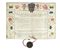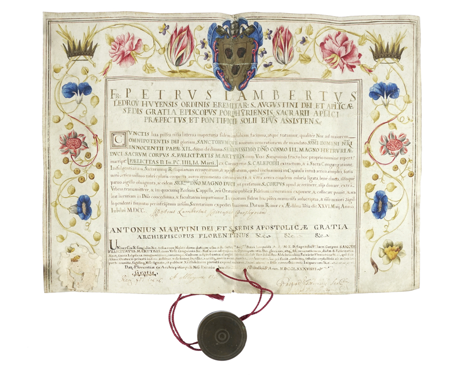 Attestato di donazione delle reliquie di Santa Felicita. Datato Roma, 26 maggio Anno Iubilaei 1700 e Firenze 1789. Manoscritto pergamenaceo a inchiostro bruno e dorato impreziosito dalle armi di Papa Innocenzo XII e da decorazioni policrome floreali che incorniciano il testo. Nota successiva in calce, sempre in latino, datata Firenze 1789. Conservato spago con sigillo papale in ceralacca (danneggiato e in parte mancante) in custodia di ottone. Dimensioni mm 490x350. (1)Il documento attesta la donazione, de mandato di Papa Innocenzo XII, al Serenissimo Domino Cosimo III Magno Hetruriae Duci, delle sacre reliquie di Santa Felicita Martire, cum vase sanguinis. È intestato e firmato dal frate Petrus Lambertus Episcopus Porphirensis (vescovo dell'antica diocesi di Porfireone, nell'attuale Israele), in qualità di Assistente al Soglio Pontificio. Le reliquie sono tratte dal cimitero di San Calepodio (catacombe, Roma). La nota al piede della pergamena, datata 1789, è l'accettazione del sacro dono da parte dell'Arcivescovo di Firenze Antonio Martini, che destina le reliquie (Sacra Lipsana) alla cappella privata (Altare Oratorii privati in suis aedibus) di un patrizio fiorentino.