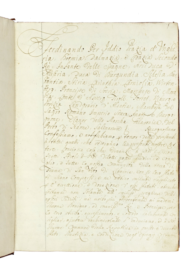 Gli Statuti della terra di Fiume. XVIII secolo. Manoscritto cartaceo a inchiostro bruno. Pagine 304 pagine scritte cui seguono 8 bianche. Testo in italiano. Legatura coeva in piena pelle con dorso a 5 nervi. Condizioni più che buone. Dimensioni 220x310. (1)Trascrizione settecentesca dell'atto con cui l'imperatore Ferdinando I d'Asburgo confermava, il 29 Luglio 1530, gli Statuti medievali della communità di Fiume di San Vito di Liburnia. Il corposo manoscritto è suddiviso in 4 parti (libri) e presenta alla fine un indice analitico (il secondo libro è corredato anche di indice alfabetico). I titoli dei libri sono: Primo Libro degl'Uffizi overo Statuti, e prima del Mag.o Messer Capitanio, e suo giuramento; Secondo Libro delle Cause Civili, delle ferie introdotte in honor di Dio e dei Santi; Libro Terzo delle Cause Criminali; Libro Quarto degli straorninarij del proibito lavorare, e tenere le Botteghe aperte nelli giorni delle feste. Tra le centinaia di argomenti trattati, citiamo alcuni dei più curiosi: degl'Assassini, Proditori e Sodomiti; di quelli che non possono andar di notte con armi[...] nella terra di Fiume; del furto delle galline, oche e simili [...]; di quelli che sforzano le donne, e tengono le mogli d'altri, ò famiglie che hanno avuto due mogli [...]; dell'Erbarie, e fatture; del modo di misurar il panno di lino; di quelli che giocano alli dadi [...]; delli cani delli Vilani, ed altri, che fanno il danno nelle vigne; delle Putane dove debbon stare; di quelli che danno cavalli à vettura, over à nolo.