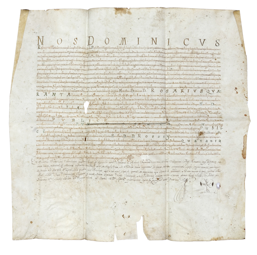 Laurea in medicina e filosofia dell’Università di Salerno. Datata 1745. Manoscritto pergamenaceo (mm 680x640) a inchiostro bruno. Testo in latino. Alcuni minimi difetti. Foglio conservato ripiegato. SI AGGIUNGE: Laurea in giurisprudenza dell'Università di Napoli, con cornice al testo. Datata 1823. (2)I DOCUMENTO: Laurea in favore di Rosario Quaranta. Manoscritto con intestazione Nos Dominicus Robertellios Salernitanus philosophix et Medicinae Doctor Prior Almi Collegij Salernitani [...]. Si tratta di Domenico Robertelli, priore della Scuola Medica salernitana dal 1731 fino al 1746. In fine la completio notarii, sottoscrizione del notaio Carlo Barone di Salerno, cui segue il segno di tabellionato.