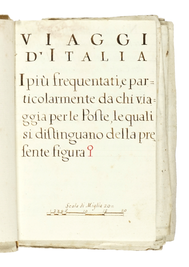 Viaggi d'Italia i più frequentati, e particolarmente da chi viaggia per le Poste, le quali si distinguano dalla presente figura. XIX secolo. In-12° (mm 145x90). Carte [2] con 14 tavole disegnate e acquerellate, ciascuna ripiegata e preceduta da una carta con titolo manoscritto. Legatura coeva in pieno cartonato rustico. Alcune macchie in corrispondenza del dorso. (1)
