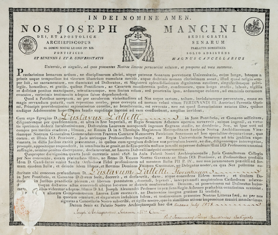 Diploma di Laurea dell'Università di Siena conferito al bibliofilo ed editore Gustavo Camillo Galletti. Datato 8 luglio 1828. Testo a stampa con note e firme manoscritte su pergamena. Testo in latino. Sigillo in carta, perfettamente conservato, dell'arcivescovo di Siena Giuseppe Mancini. Dimensioni: mm 355x415. (1)Si tratta del diploma in giurisprudenza del celebre bibliofilo fiorentino. La sua biblioteca di argomento storico e letterario, ricchissima di manoscritti e volumi a stampa, dopo la morte di Galletti confluì in parte nella collezione Landau-Finaly e in seguito, in buona parte, nella Biblioteca Nazionale di Firenze.