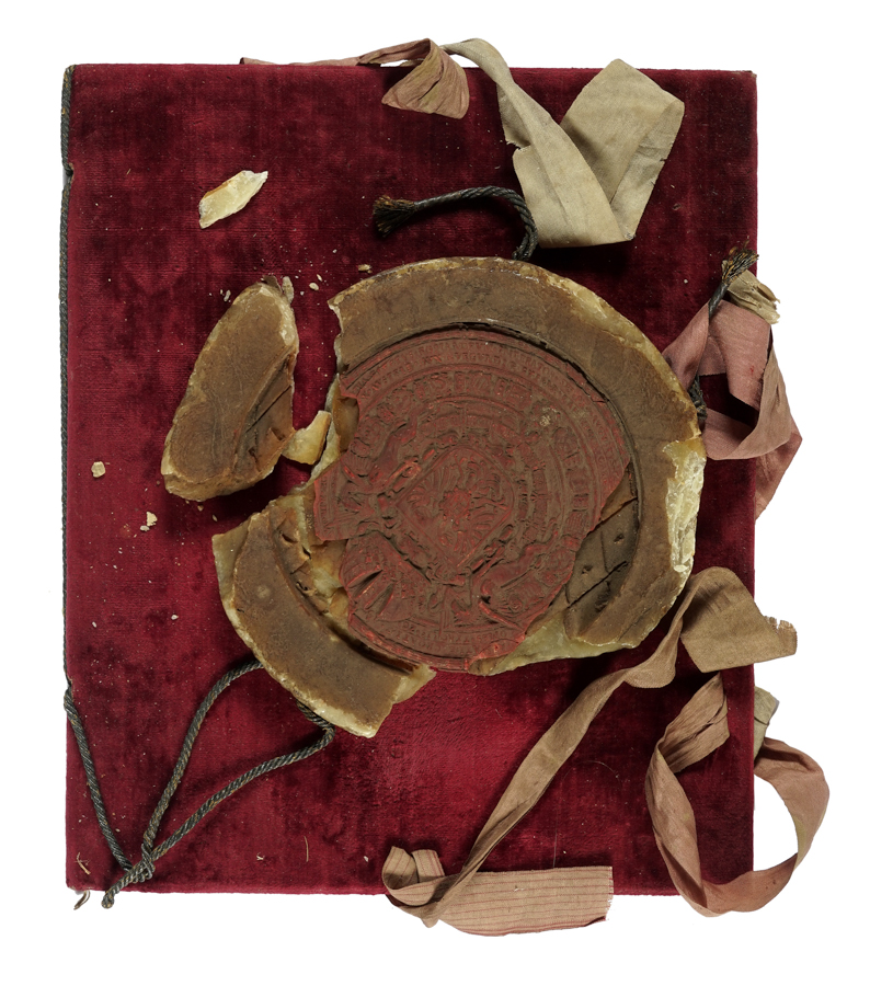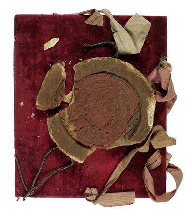 d'Asburgo Ferdinando III, Conferimento del titolo di Miles et Eques auratus, con firma autografa dell'imperatore Ferdinando III. Ratisbona, 1 ottobre 1653. Manoscritto pergamenaceo a inchiostro bruno, con firma autografa dell'imperatore in fine al testo. Fogli 6 (il primo bianco; sull'ultimo, firma di dignitario di corte). Due carte di guardia. Testo in latino. Il f. 2 è scritto in nero e oro. Nel testo, 6 capilettera, il nome del beneficiario, il suo titolo e la dicitura finale (Ad mandatum Sacrae Caesareae Maiestatis proprium) in oro. Legatura in velluto rosso con lacci in seta. Grande sigillo (diam. 180 mm) in cera e ceralacca (con alcune mancanze) e lacci in seta oro e nera. Ampi margini e ottima conservazione. Specchio di scrittura: 170x190 mm. Dimensioni: 240x290 mm. (1)Ferdinando III d'Asburgo (1608-1657), imperatore del Sacro Romano Impero, ricordato per la Guerra dei Trent'anni, conferisce il titolo di Miles et Eques auratus a Jacopo Ariberti, attribuendogli il grado militare, la fascia e le insegne dell'Ordine Equestre. Nell'atto vengono ricordati il fratello di Jacopo, Giovanbattista Ariberti, il padre dell'imperatore, Ferdinando II, e il cardinale-infante di Spagna Ferdinando, consobrino (cugino) di Ferdinando III. L'atto è stato firmato a Ratisbona, città dove nel 1641 era stata indetta una dieta imperiale per decidere gli accordi di pace della Guerra dei Trent'anni. In calce al documento è presente la firma autografa di Ferdinando III e quella del dignitario che ha registrato l'atto.
