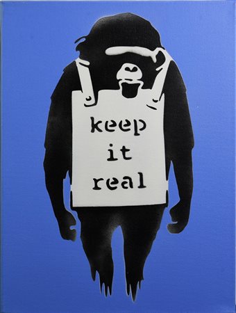 Banksy KEEP IT REAL spray stencil su tela, cm 40x30x4; es. 4/50 firma a...