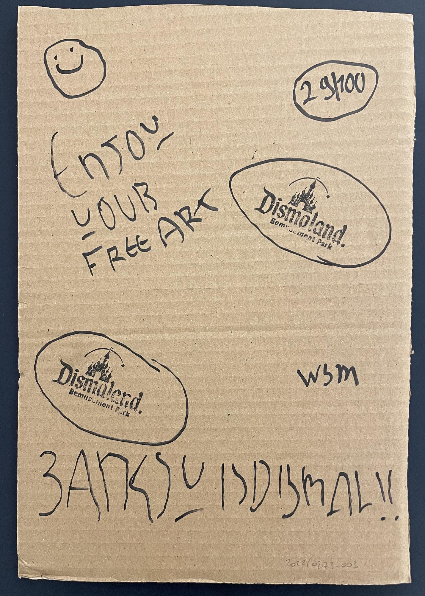 sul retro: tiratura e timbri Dismaland, iscritto "Enjoy your free Art" e "Banksy is Dismal!!"