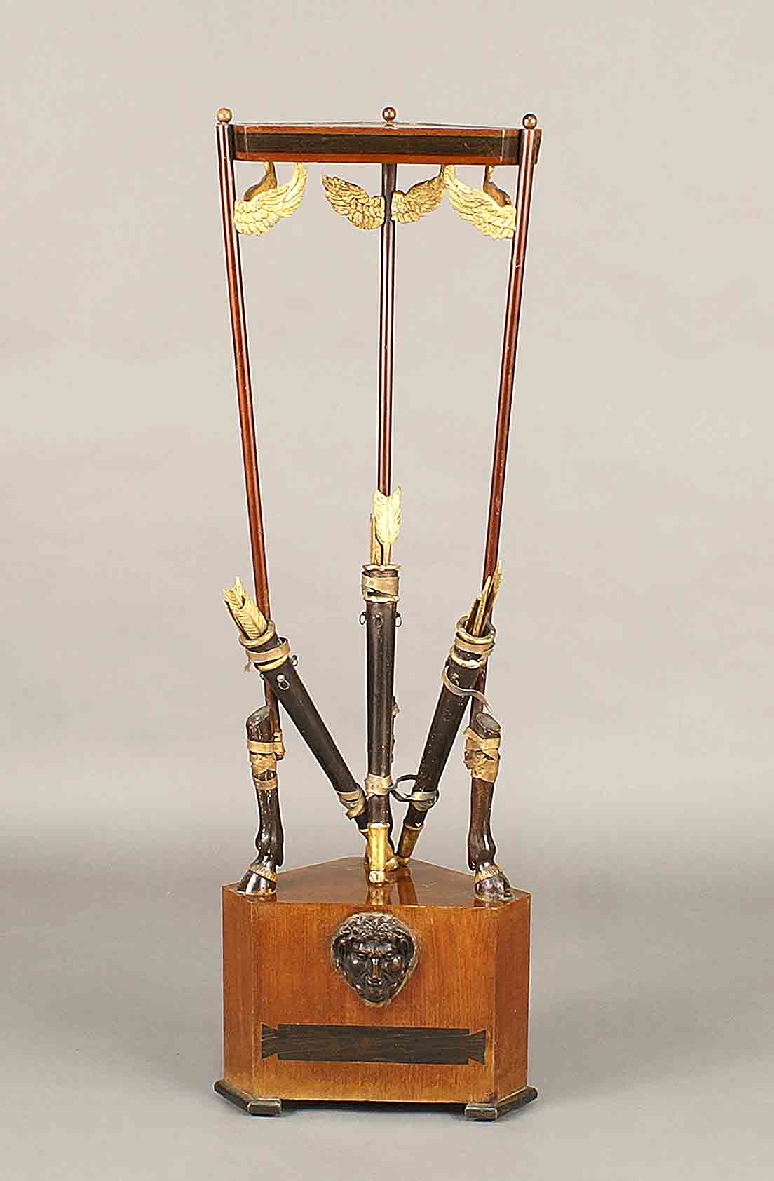Gueridon in mogano, legno ebanizzato e parzialmente dorato, piano triangolare...