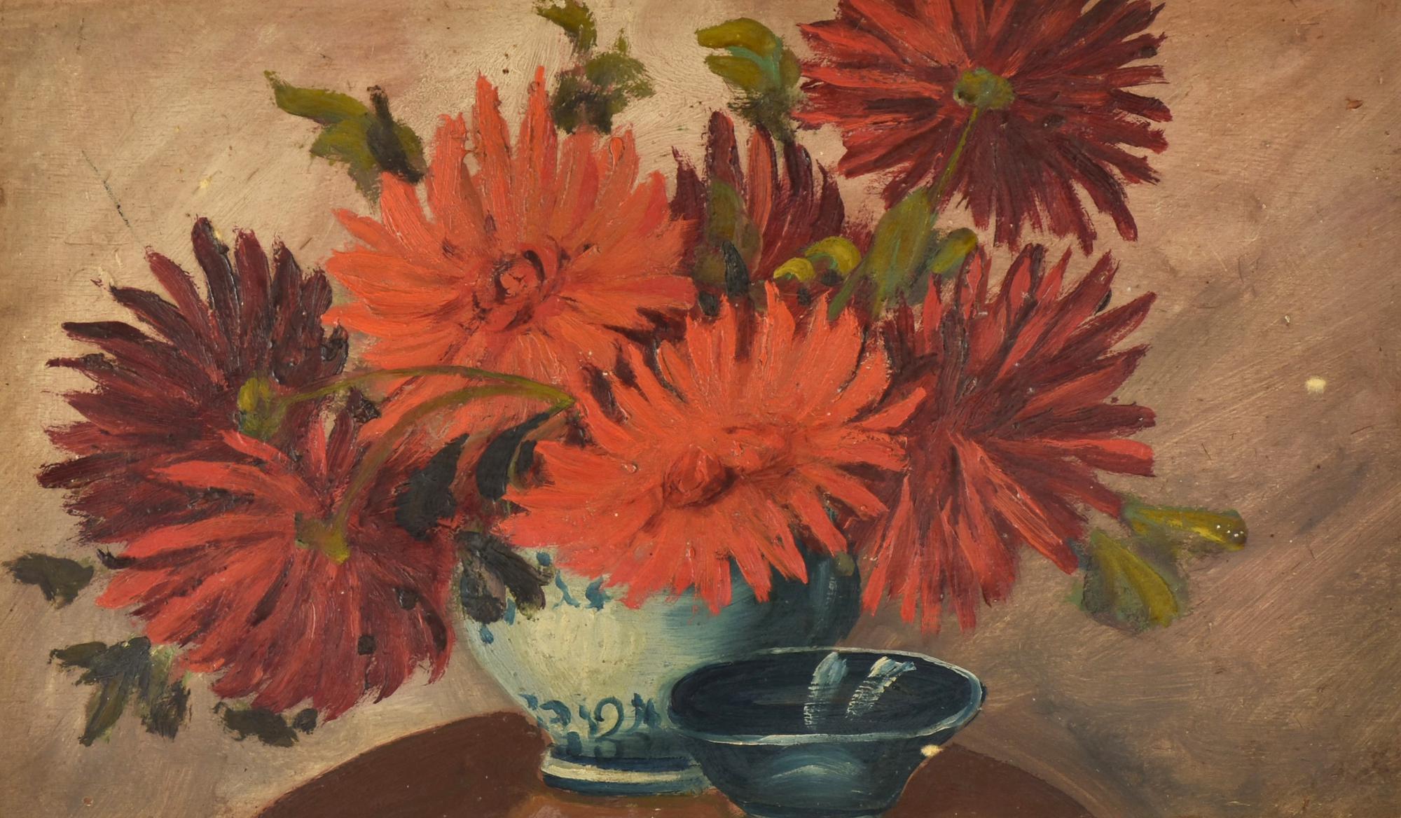Anonimo VASO CON FIORI ROSSI olio su tavola, cm 20x33
