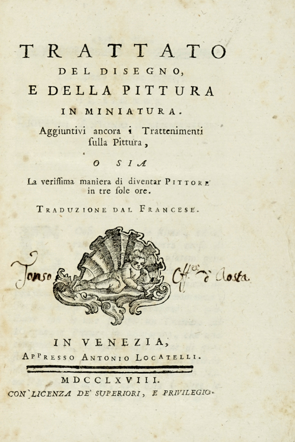 Trattato del disegno e della pittura in miniatura. Aggiuntivi ancora i Trattenimenti sulla Pittura, o sia La verissima maniera di diventar Pittore in tre sole ore. In Venezia: appresso Antonio Locatelli, 1768.
