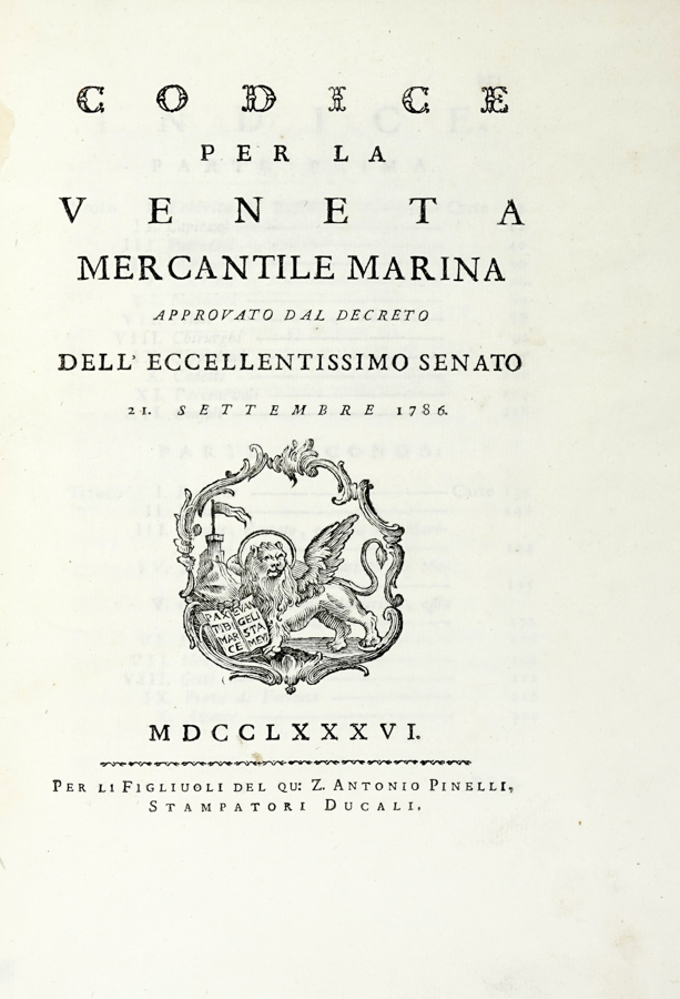 Codice per la veneta mercantile marina approvato dal decreto dell'eccellentissimo Senato 21. settembre 1786. [Venezia]: Per li figliuoli del qu. Z. Antonio Pinelli, stampatori ducali, 1786.