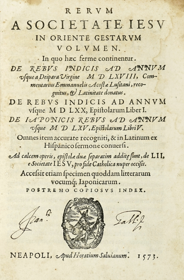 Acosta Manuel, Rerum a Societate Iesu in Oriente gestarum volumen... Neapoli: apud Horatium Salvianum, 1573.