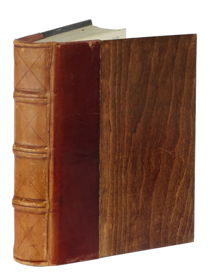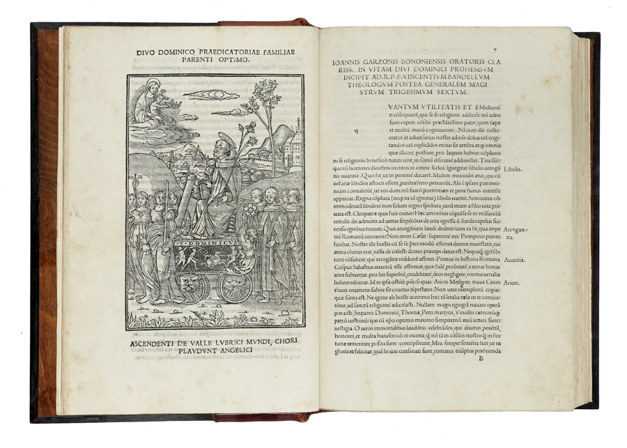 In-folio (mm 290x200). Carte 61, [1] bianca, 62-268. Segnatura: A-G⁶, H⁸, I-Z⁶, &⁶, cum⁸, 2A-2P⁶, 2Q⁸, 2R-2S⁶, 2T⁴. Presente la carta bianca K6. Spazi per capilettera con letterine-guida. Marca tipografica incisa in legno al recto dell'ultima carta. Frontespizio in ricca cornice xilografica, formata da quattro legni, con decorazione a candelabra, putti e figure mitologiche. Identica cornice a inquadrare quattro xilografie a piena pagina con i trionfi dei santi domenicani (carte I1r, L1r, Y1r, AA1r, SS1r) e la prima pagina di testo di ogni singolo libro (carte I2r, L2r, Y2r, AA2r, SS2r). Priva di cornice la xilografia a piena pagina alla carta A6v, con il trionfo di San Domenico. Esemplare parzialmente rifilato, con macchie sparse e restauri alle carte I6, Y1, 2A1, 2A6, 2Q2, 2R2, 2T3-2T4, alcuni dei quali integrativi. Legatura moderna in mezza pelle su assi di legno; dorso a tre nervi, leggermente abraso. Ex-libris in carta sciolto; vignetta xilografica con allegoria della libertà (Bononia docet) impressa su carta e applicata al contropiatto anteriore. (1)