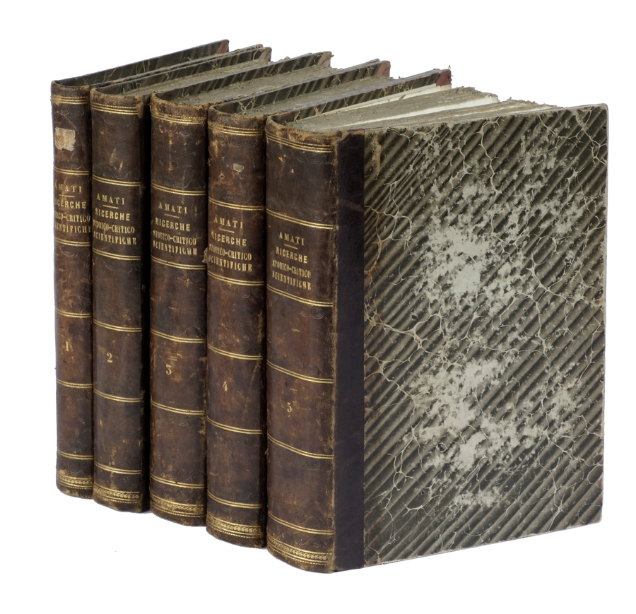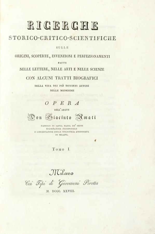 Amati Giacinto, Ricerche storico-critico-scientifiche sulle origini, scoperte, invenzioni e perfezionamenti fatti nelle lettere, nelle arti e nelle scienze... Tomo I (-V). Milano: coi tipi di Giovanni Pirotta, 1828-1830.