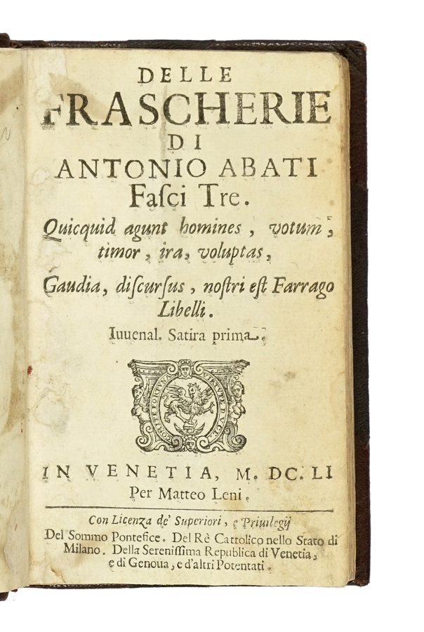 2 parti in 1 volume in-12° (mm 135x75). Antiporta figurata in principio di ogni parte. Legatura coeva in piena pergamena con titolo manoscritto al dorso. SI AGGIUNGE: Abati Antonio, Delle frascherie. In Venetia: per Matteo Leni, 1651. In-12° (mm 145x90). Antiporta figurata. Legatura moderna in mezza pelle con punte e piatti in percallina. Titolo in oro al dorso. (2)