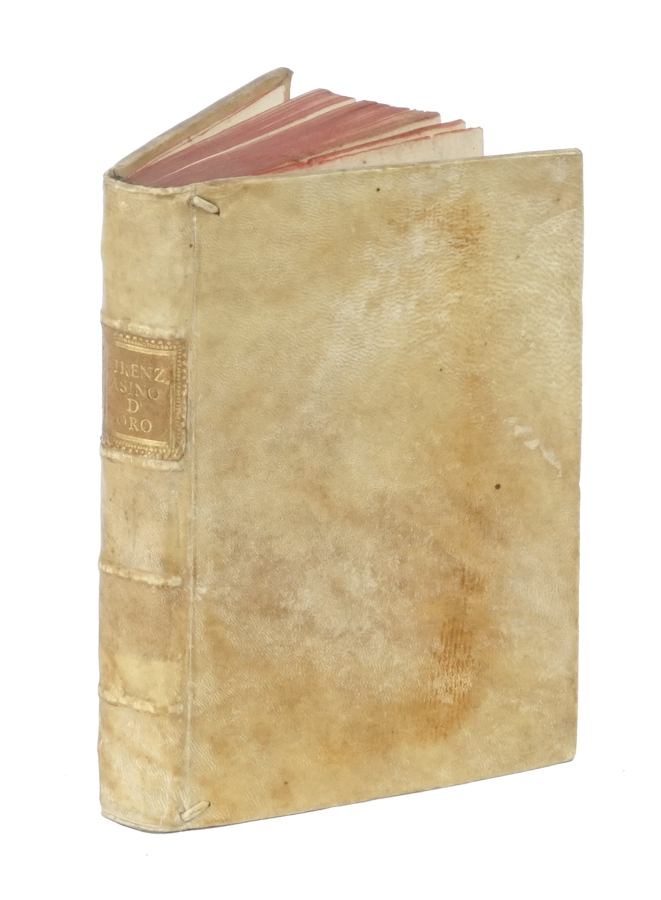 In-8° (mm 149x90). Pagine 327, [7]. Assente l'ultima carta bianca ma presente la carta di guardia posteriore. Al frontespizio marca tipografica con il giglio fiorentino entro cornice figurata, alla carta X7v altra marca raffigurante un serpente attorcigliato lungo il tronco di un giglio che lascia cadere a terra la vecchia pelle. Capilettera in legno nel testo. Lieve gora d'acqua a tutto il volume, piccolo lavoro di tarlo al margine interno dei fascicoli I-N. Legatura in piena pergamena con titoli in oro su tassello in pelle al dorso. Tagli rossi. (1)