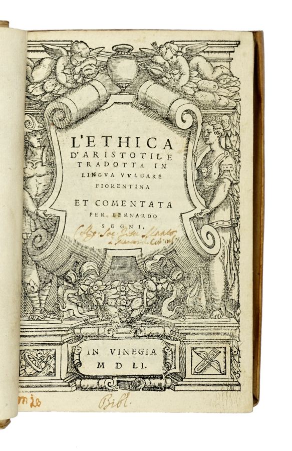 Aristoteles, L'Ethica [...] tradotta in lingua vulgare fiorentina et comentata per Bernardo Segni. In Vinegia: s.e., 1551.
