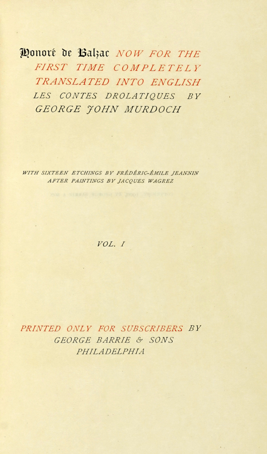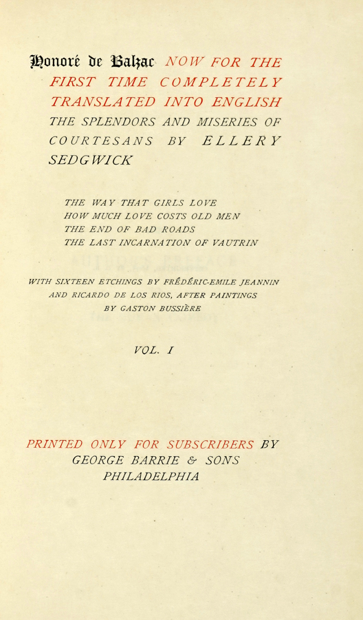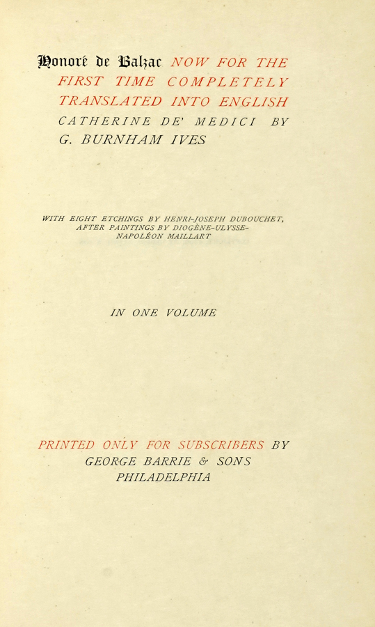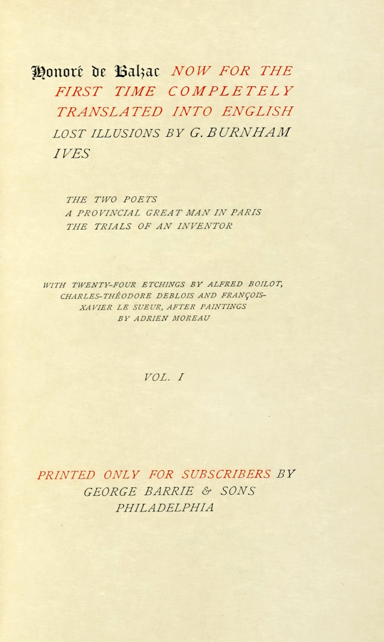 Balzac Honoré (de), [Complete works] now for the first time completely translated into English [...] by G. Burnham Ives. Vol 1 (-53). Philadelphia: Printed for Subscribers Only by George Barrie & Son, 1895-1900.