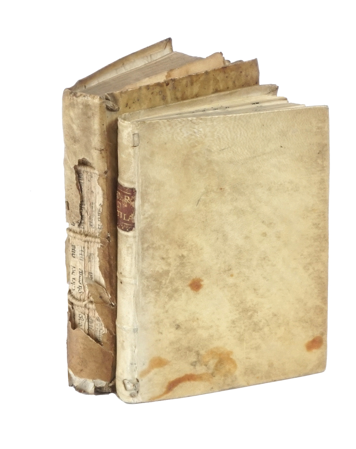 In-8° (mm 135x92). Carte 103, [13]. Assente l'ultima carta bianca. Vignetta e riquadro decorativo in legno al frontespizio. Testatine xilografiche abitate nel testo. Esemplare rifilato al margine superiore con perdita di parte della prima riga di testo. Una gora d'acqua alla prima carta, parzialmente staccata. Legatura in piena pergamena rigida con titoli in oro su tassello in pelle al dorso. Macchie al piatto anteriore. SI AGGIUNGE: Emesenus Heliodorus, La dilettevole historia... In Genova: [Antonio Roccatagliata], 1582. In-8° (mm 151x101). Pagine 24, 398 [i.e. 399], [1]. Marca xilografica al frontespizio. Testatine, capilettera e finalini in legno nel testo. Carta A8 staccata ma presente. Pagine brunite, gore d'acqua ai margini di tutto il volume. Legatura muta in piena pergamena molle. Copiose mancanze al dorso. (2)