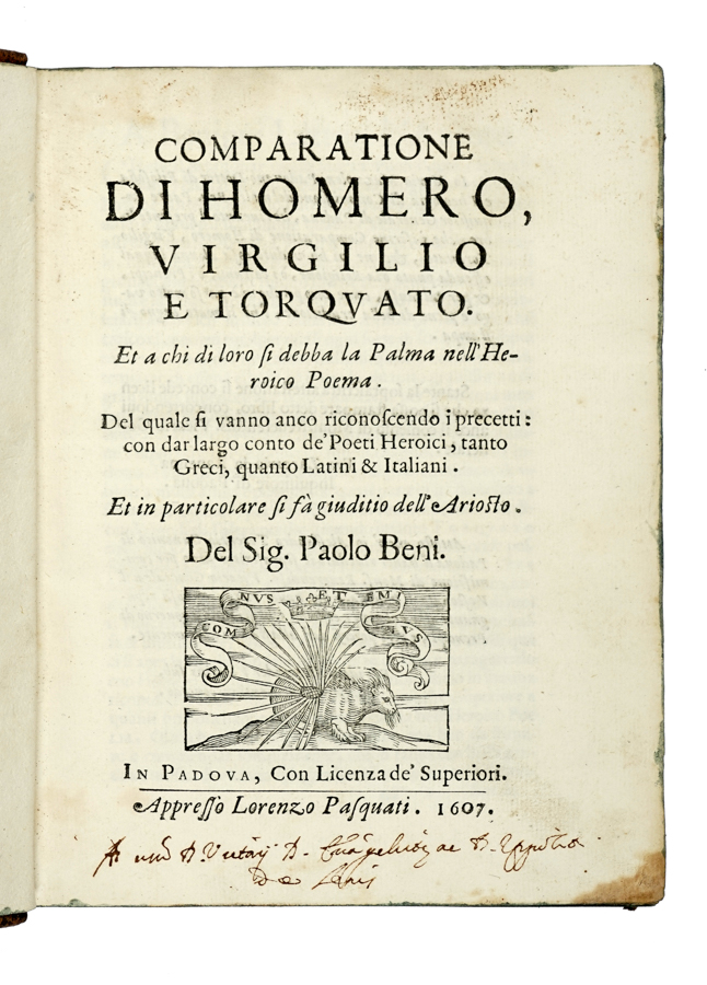 Beni Paolo, Comparatione di Homero, Virgilio e Torquato. Et a chi di loro si debba la palma nell'heroico poema. In Padova: appresso Lorenzo Pasquati, 1607.