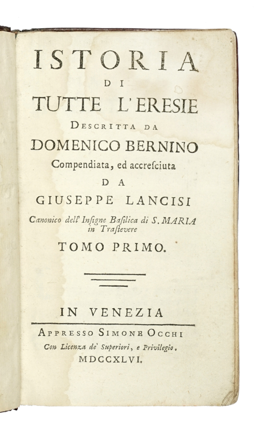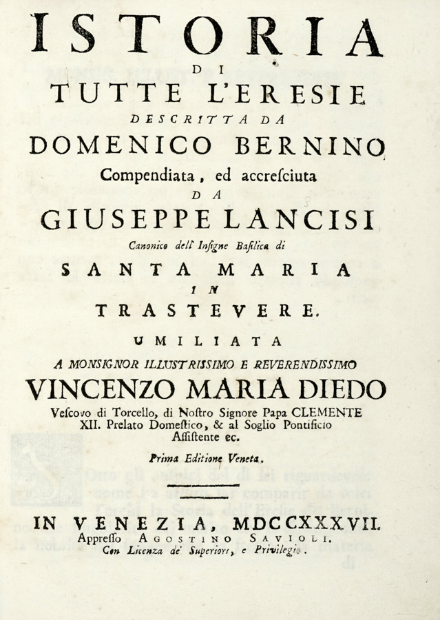 Bernino Domenico, Istoria di tutte l'eresie... In Venezia: appresso Agostino Savioli, 1737.