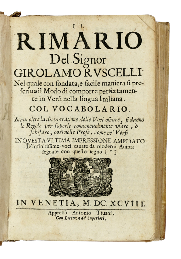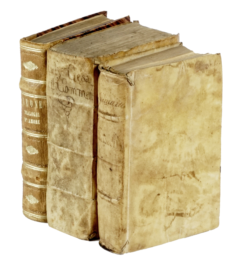In-8° (mm 148x100). Carte [8] di [12], 398, [1]. Marca aldina ripetuta al frontespizio e in fine. Copia priva delle carte da a2 a a5, a6, a7 e a8 mal ripiegate ma presenti. Restauri marginali a poche carte, copia lievemente gorata. Legatura coeva in piena pergamena floscia con titolo manoscritto al dorso. SI AGGIUNGE: Abrabanel Isaac ben Judah, Dialoghi di amore composti per Leone medico hebreo. In Vinegia: [marca aldina], 1558. (Al colophon:) In Venetia: per Isepo Guglielmo Vicentino, 1558. In-8° (mm 145x95). Carte 228. Marca aldina ripetuta al frontespizio e infine. Frontespizio parzialmente controfondato. Parte delle carte brunita, ma copia completa. Legatura ottocentesca in mezza pelle con piatti in cartonato e titolo in oro al dorso. SI AGGIUNGE: Ruscelli Girolamo, Il rimario [...] in questa ultima impressione ampliato. Venetia: appresso Antonio Tivani, 1698. 1 volume in-8° (mm 141x90). (3)