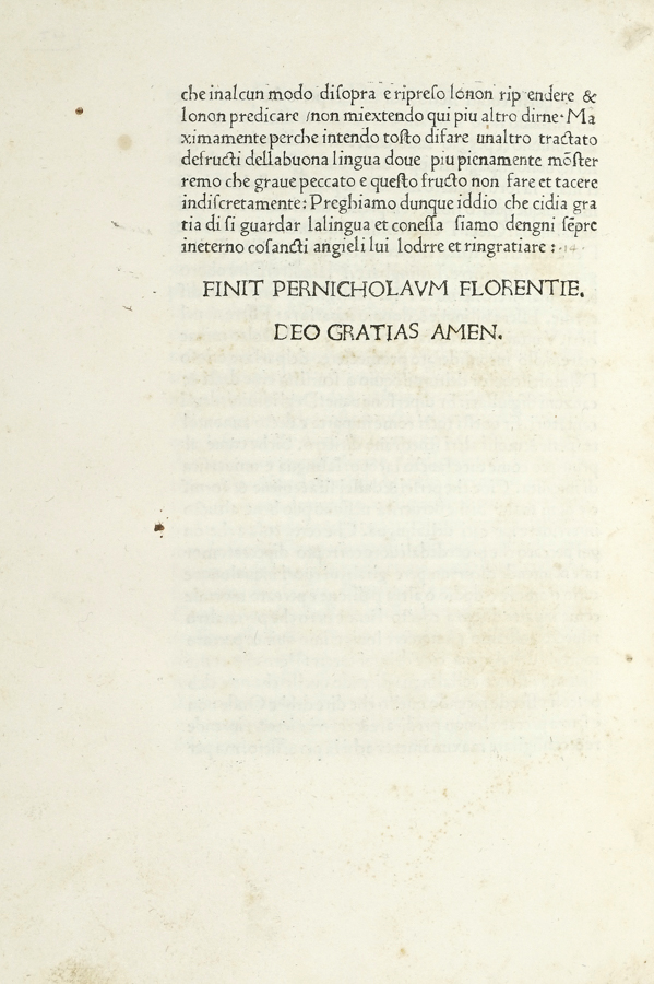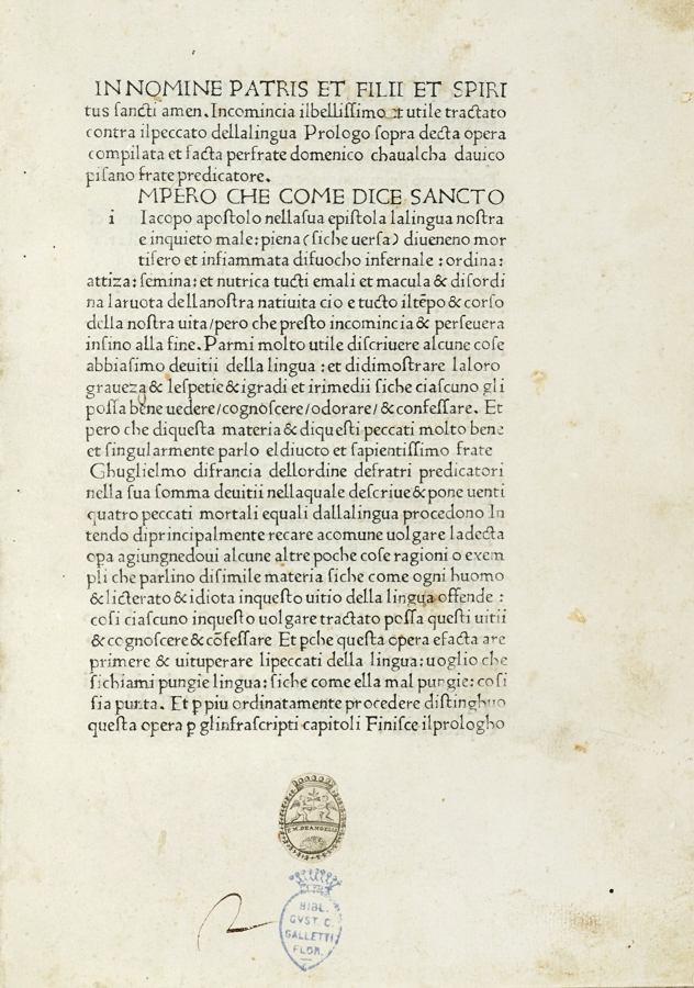 Cavalca Domenico, Pungi lingua. (Al colophon:) Florentie: per Nicholaum Florentie, s.d. [i.e. 1476-1477 ca.].