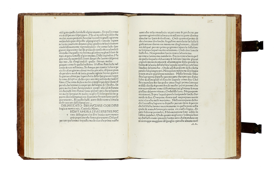 In-4° (mm 272x191). Carte [117] (di 118). Segnatura: a10, b–p8, q4 (-q4). Testo in caratteri romani, su 31 righe. Spazi per iniziali con letterine guida. Mancante la carta q4 bianca. Fioriture e qualche macchiolina sparsa, altrimenti ottimo esemplare marginoso. Legatura con assi lignee coeve e dorso in cuoio posteriore fissato con chiodi e fregiato a secco in stile d'epoca; fermagli ai piatti e tagli gialli. Scheggiature e mancanze alle punte, altrimenti buone condizioni. Ex libris d'arme (Francesco Ricciardi di Vernaccia) ed ex-libri del Barone Horaz Von Landau al contropiatto anteriore; timbro a inchiostro Conte Gustavo Galletti di Firenze e piccola etichetta stemma (FM de Angelis) in calce alla carta a1; ex-libri cartaceo (MB) sciolto. (1)