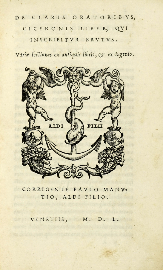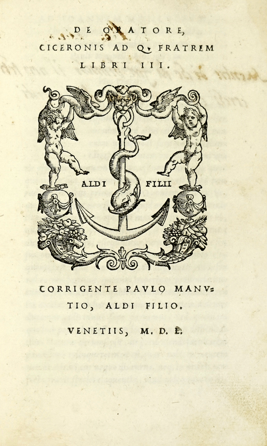 Cicero Marcus Tullius, De oratore [...] libri III. Venetiis: [eredi di Aldo Manuzio 1.], 1550. (Al colophon:) Venetiis: apud Aldi filios, 1550.