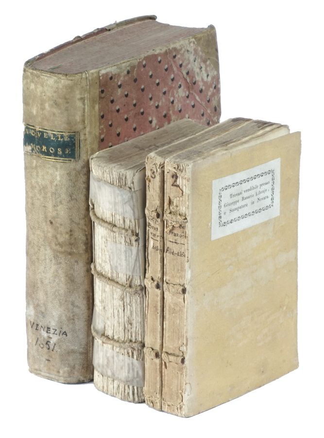 In-8° (mm 160x105). Carte 136 [i.e. 137], [1]. Marca aldina ripetuta al frontespizio e in fine. Ripetuta nella numerazione la carta 134. Alcune carte macchiate. Legatura ottocentesca in pieno cartone con titolo manoscritto al dorso e pecetta cartacea al piatto anteriore (trovasi vendibile presso Giuseppe Rasario Librajo, e stampatore in Novara). Mancanze al dorso. SI AGGIUNGE: Id., De claris oratoribus. Venetiis: [eredi di Aldo Manuzio 1.], 1550. (Al colophon:) Venetiis: apud Aldi filios, 1550. In-8° (mm 160x105). Carte 56. LEGATO CON: Id., Orator Ciceronis ad M. Brutum. Venetiis: [eredi di Aldo Manuzio 1.], 1550. (Al colophon:) Venetiis: apud Aldi filios, 1550. Carte 45, [3]. Ciascuna parte con marca aldina ripetuta al frontespizio e in fine. Legatura ottocentesca in tutto cartone. SI AGGIUNGONO: Caesar Gaius Julius, [Commentariorum De bello Gallico, libri VIII]. [Venetiis: in aedibus Manutianis, 1566]. Copia scompleta e senza legatura. [Novelle amorose de' signori Academici Incogniti]. XVII secolo. 3 parti in 1 volume, scompleto di frontespizio e carte preliminari. (4)