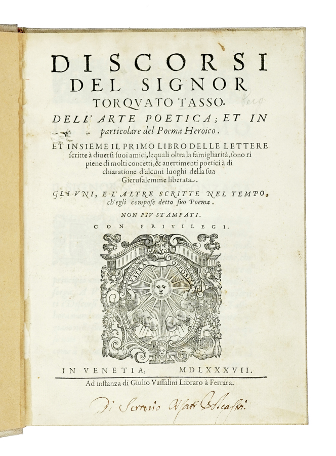 In-8° (mm 140x90). Carte [84]. Frontespizio xilografico. Ultima carta rinforzata, alcune macchioline e difetti conservativi. Legatura successiva in piena pergamena rigida con titoli in oro su falso tassello al dorso. SI AGGIUNGE: Tasso Torquato, Discorsi [...] Dell'arte poetica; et in particolare del poema heroico. In Venetia: ad instanza di Giulio Vassalini libraro à Ferrara, 1587. In-4° (mm 190x140). Carte [4], 108. Copia con gore (concentrate nella prima metà dei fascicoli) e altri difetti marginali, un po' corta di margini. Legatura successiva in piena pergamena rigida con titolo in oro su tassello al dorso. (2)