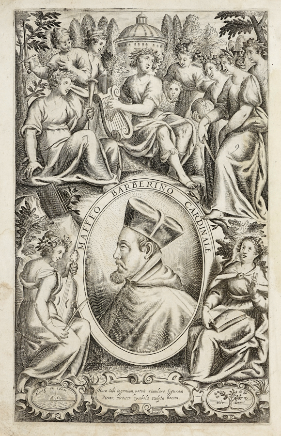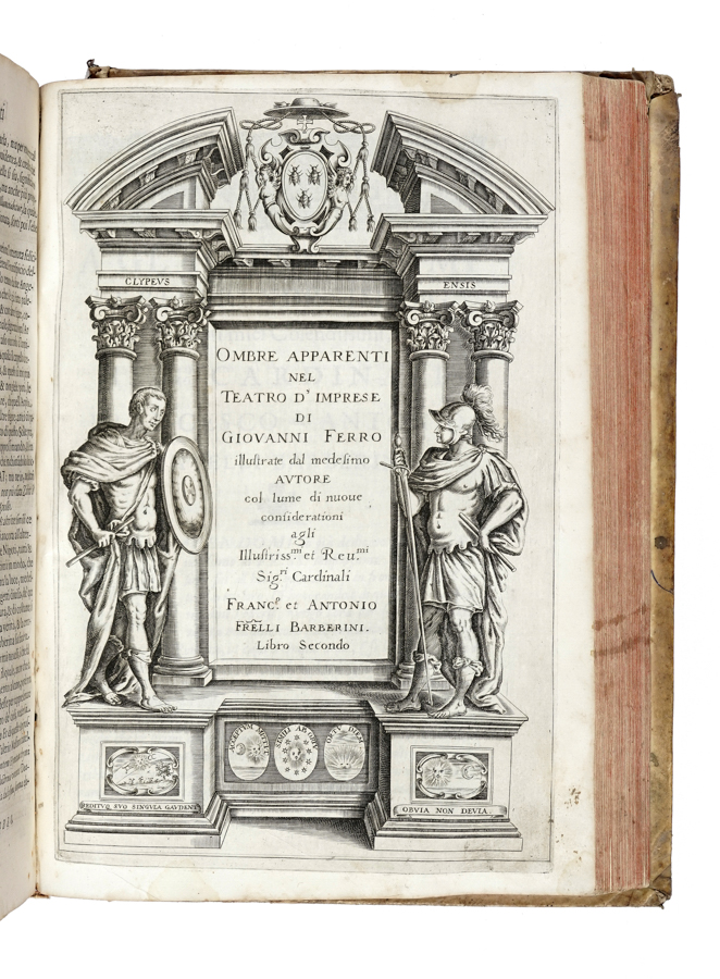 2 parti in 1 volume in folio (mm 305x210). Pagine [36], 296; [180], 728, [2], 2 bianche. In principio di volume (incluso nella numerazione) 1 ritratto del Dedicatario, 1 carta con fregio architettonico con stemma Barberini e medaglione e 1 frontespizio inciso; alla seconda parte frontespizio calcografico e ritratto dell'Autore alla carta L10V. Staccate le prime 4 carte, contenenti l'occhietto e le tre carte incise, con uno strappo parzialmente restaurato alla carta di fregio. Alcune gore marginali e sporadiche macchie, uno strappo che interessa l'inciso a carta D1, ma copia completa. LEGATO CON: Id., [Ombre apparenti nel teatro d'imprese]. (Al colophon:) In Venetia: appresso Giacomo Sarzina, 1629. 2 parti in 1 volume. Pagine [78] di [80], 104; [4], 358. Assente in frontespizio inciso della prima parte. Seconda parte gorata. Legatura coeva in piena pergamena rigida. Tagli rossi. Assente il dorso, staccato il piatto anteriore. (1)