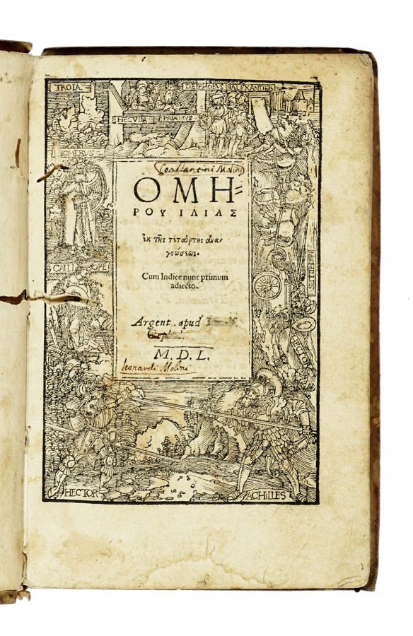 Homerus, Ilias. Argent.: apud Vuolf. Cephal., 1550 (Al colophon:) Argentorati: apud Vuolfgangum Cephalaeum, 1550 mense martio.