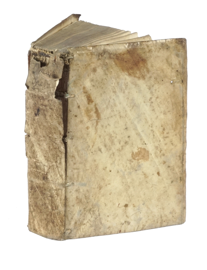 In-8° (mm 160x100). Carte [8], 277, [3]. Frontespizio entro ampia cornice xilografica figurata con i personaggi dell'Iliade. Lavoro di tarlo nel margine interno delle carte con perdita di parte di testo in alcuni fascicoli, copia gorata, altri difetti conservativi. Il riferimento all'editore (Wolfgang Kopfel) è stato rimosso sia dal frontespizio che dal colophon. Legatura in piena pergamena floscia con titolo manoscritto al dorso. Mancanze lungo le cerniere. Al contropiatto anteriore ex-libris cartaceo di precedente collezione. Alcune note di possesso manoscritte in principio di volume. (1)