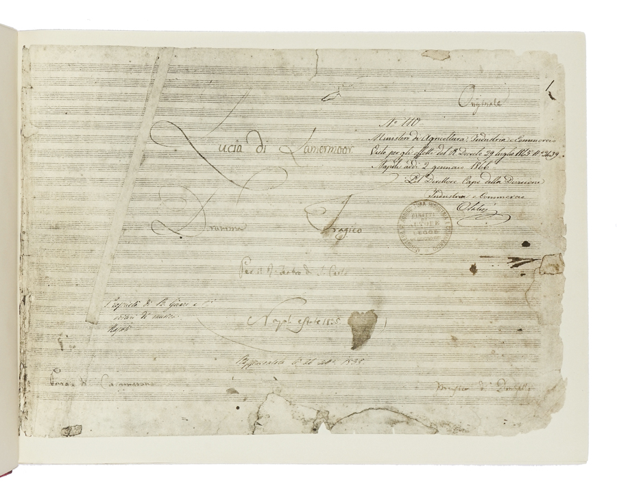 Donizetti Gaetano, Lucia di Lammermoor. Dramma tragico [...] riprodotta integralmente per mandato di Giovanni Treccani Degli Alfieri. Milano, Emilio Bestetti 1941. In folio oblungo (300x410 mm). Legatura in mezza pelle rossa. Autore e titolo in ora al piatto e filetti decorativi agli angoli. Nota introduttiva di Guido Zavadini, all'epoca Conservatore del Museo Donizettiano di Bergamo. Cofanetto (con alcuni difetti) conservato. Il volume è in ottime condizioni. Edizione di 300 esemplari (il nostro n. 282). (1)Edizione in facsimile della partitura autografa.