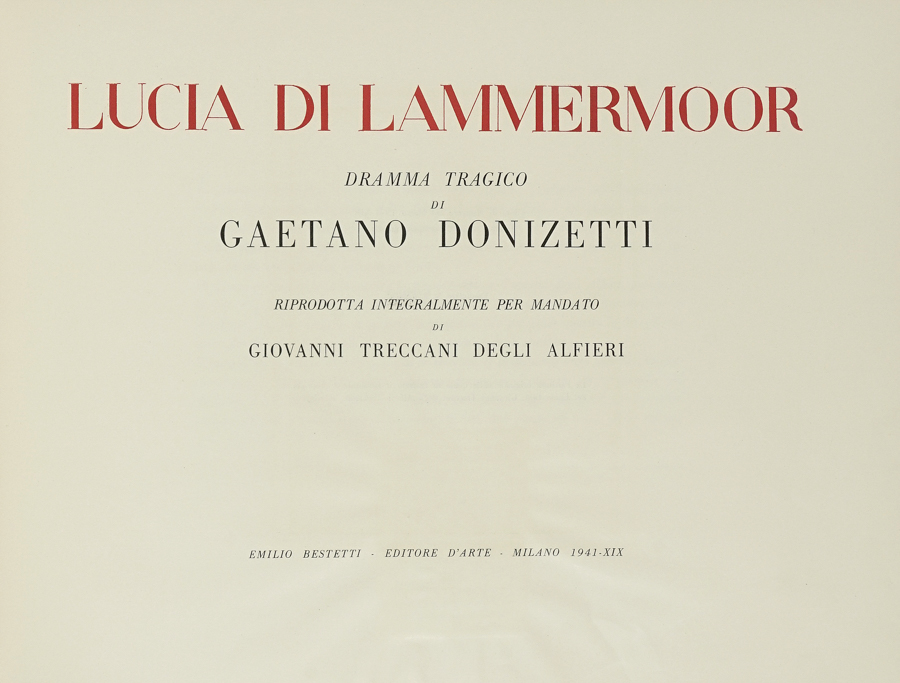 Donizetti Gaetano, Lucia di Lammermoor. Dramma tragico [...] riprodotta integralmente per mandato di Giovanni Treccani Degli Alfieri. Milano, Emilio Bestetti 1941.