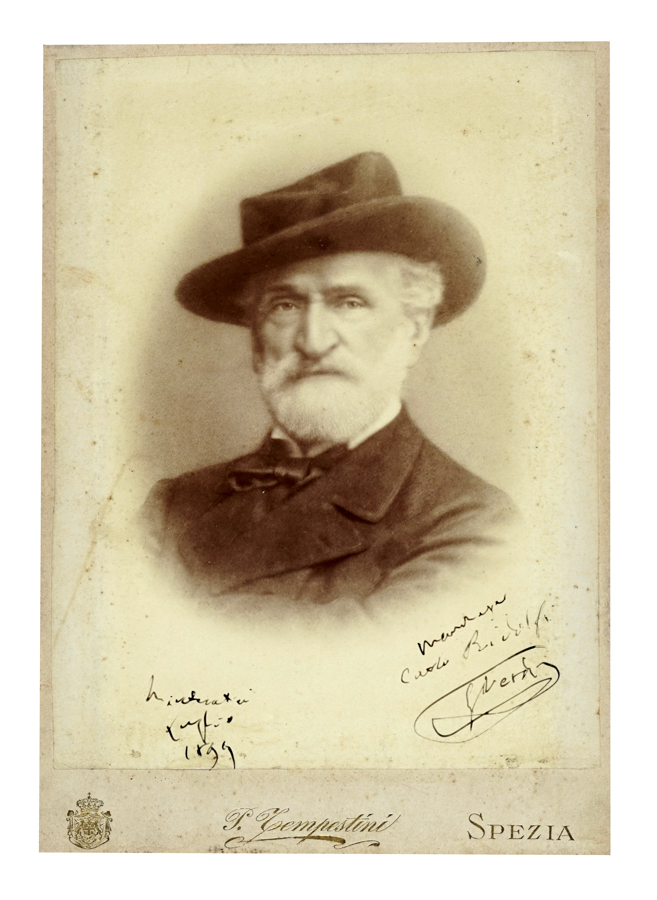 Verdi Giuseppe, Dedica e firma autografa su ritratto all'albumina. Datata luglio 1899, Montecatini. Manoscritto a inchiostro nero. La dedica è a Carlo Ridolfi. Albumina su supporto del fotografo Pietro Tempestini / Spezia. Al verso Pietro Tempestini / Premiato con dono speciale / di S. M. il Re d'Italia / Spezia / Via del Prione 35 [...] / Bagni Montecatini / Stagione estiva [...]. Dimensioni dell'albumina: 216x164 mm. Dimensioni del supporto: 248x175 mm. (1)Splendida fotografia di grandi dimensioni realizzata dallo studio Pietro Tempestini di La Spezia. In questa città, meta di turismo culturale e sede dell'Arsenale militare marittimo, il fotografo si trasferì nel 1891 aprendo due studi situati in centro città (in Via del Prione e in Corso Garibaldi). Tempestini, attivo anche a Montecatini (Locanda Maggiore presso i Bagni) fotograferà più volte il Maestro, da solo o insieme a Giulio Ricordi, Arrigo Boito e Teresa Stolz. Questi scatti divennero iconici.