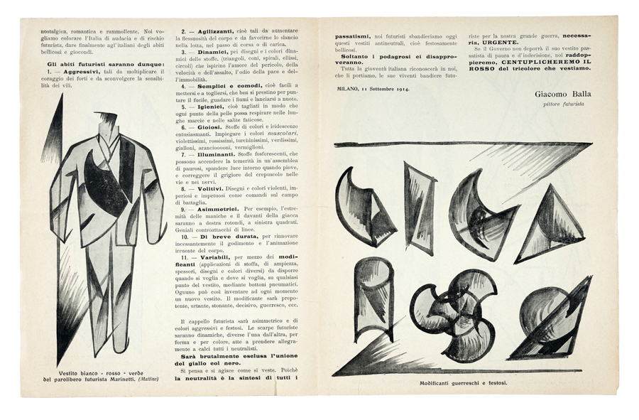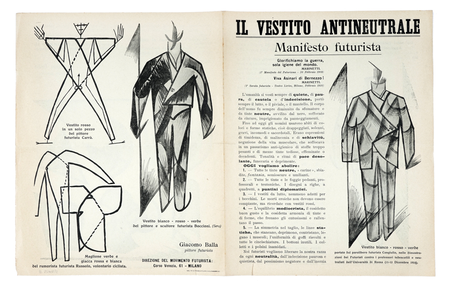 Balla Giacomo, Il vestito antineutrale. Manifesto futurista. Milano: Direzione del Movimento Futurista [Cart. Tip. A. Taveggia - Milano], 11 settembre 1914 [ma dicembre 1914].