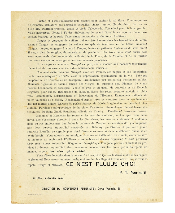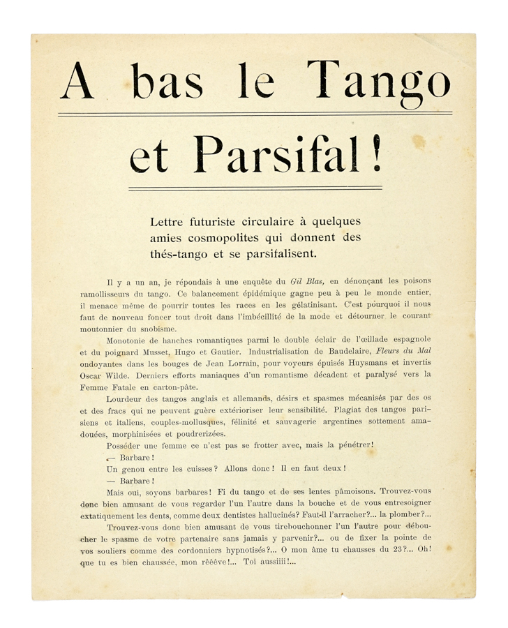 Marinetti Filippo Tommaso, A bas le Tango et Parsifal! Lettre futuriste circulaire à quelques amies cosmopolites qui donnent des thès-tango et se parsifalisent. Milano: Direction du Mouvement Futuriste, 11 Janvier 1914. In-4° (mm 290x228). Carta [1], stampata recto-verso. Una piega centrale, minime fioriture sparse e una piccola mancanza al margine inferiore senza perdita di inciso.