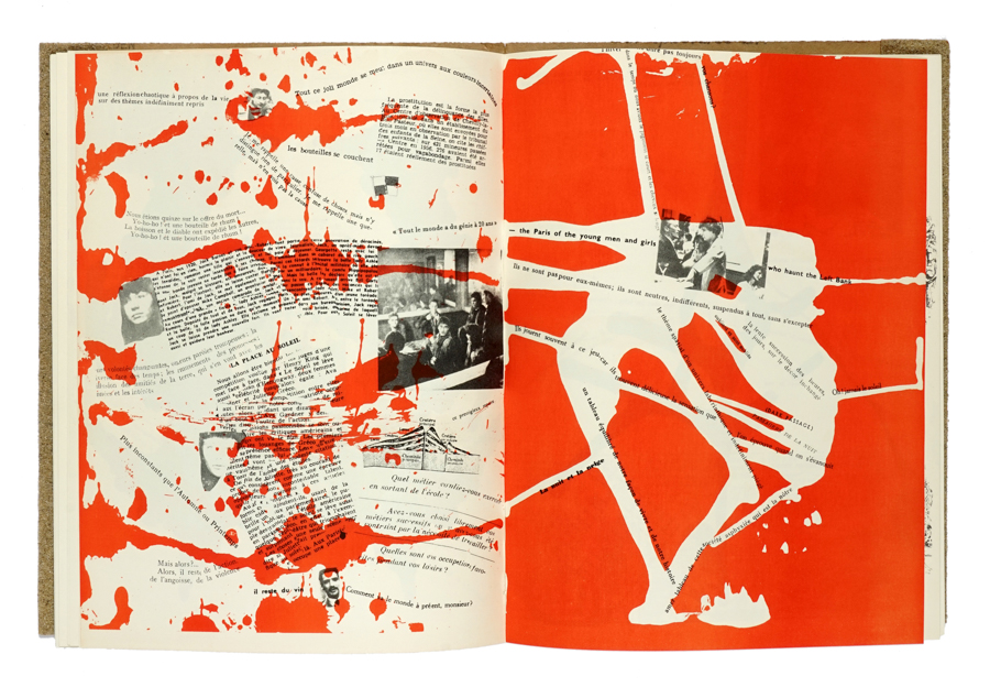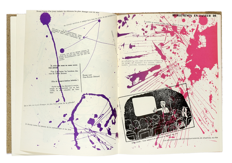 Debord Guy-Ernest, Mémoires. Structures portantes d'Asger Jorn. Copenhague: l'Internationale Situationniste, 1959. In-8° grande (mm 275x210). Carte [32] interamente impresse in litografia, con interventi artistici a colori di Asger Jorn. Ottimo stato di conservazione. Brossura editoriale muta; sovraccoperta in carta vetrata (Viks n° 2). Minimi difetti al dorso. (1)Edizione originale della seconda collaborazione tra Asger Jorn e Guy Debord, pubblicata pochi mesi dopo la fondazione dell'Internazionale Situazionista. Interamente stampata in litografia, probabilmente in un numero limitato di copie, l'opera venna distribuita al di fuori dei circuiti commerciali. Realizzata da Debord con la pratica del 'détournement' (sviluppata dall'Internazionale Lettrista e adottata dai Situazionisti), si costituisce come un collage di ritagli di testo e immagini stampati per lo più in nero e decorati con le structures portantes di Asger Jorn, forme dai colori vivaci che ricordano la pittura di Jackson Pollock; le pagine possono essere lette in tutte le direzioni e i rapporti reciproci delle frasi risultano incompiuti. La scelta di utilizzare la carta vetra per la sovraccoperta rappresenta la volontà dei due artisti di negare il libro, anche come oggetto, impedendone la vicinanza fisica con altre opere; tutto questo rende Mémoires un simbolo perfetto dell'abrasività e della non assimilazione al mainstream di Debord e dell'Internazionale.