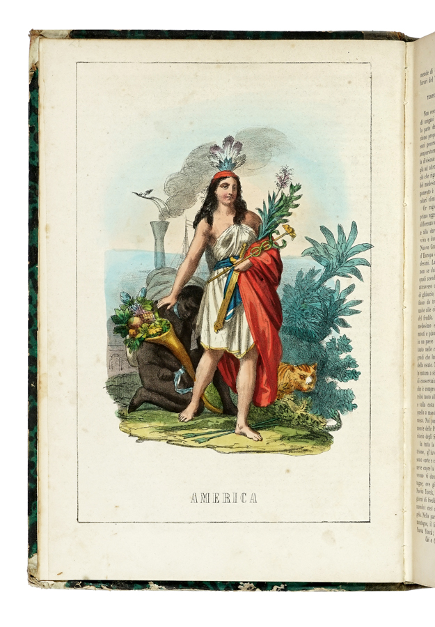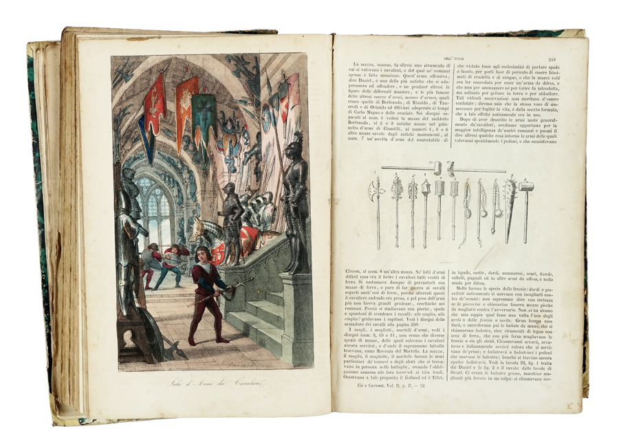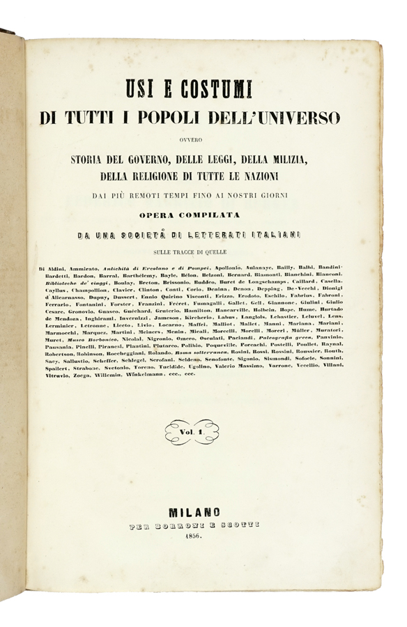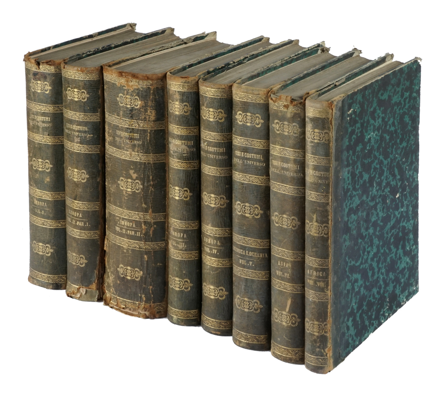 Usi e costumi di tutti i popoli dell'universo, ovvero Storia del governo, delle leggi, della milizia, della religione di tutte le nazioni... Milano: Borroni e Scotti, (poi Libreria di F. Sanvito), 1856-1862. 8 volumi in-4° (mm 290x195). Con numerose tavole a piena pagina fuori testo, alcune a colori. Fioriture sparse e altri difetti, fascicoli allentati ad alcuni volumi. Legatura in mezza pelle con piatti in carta marmorizzata e titoli impressi in oro al dorso. Mancanze alle cuffie. Collazione disponibile su richiesta. (8)