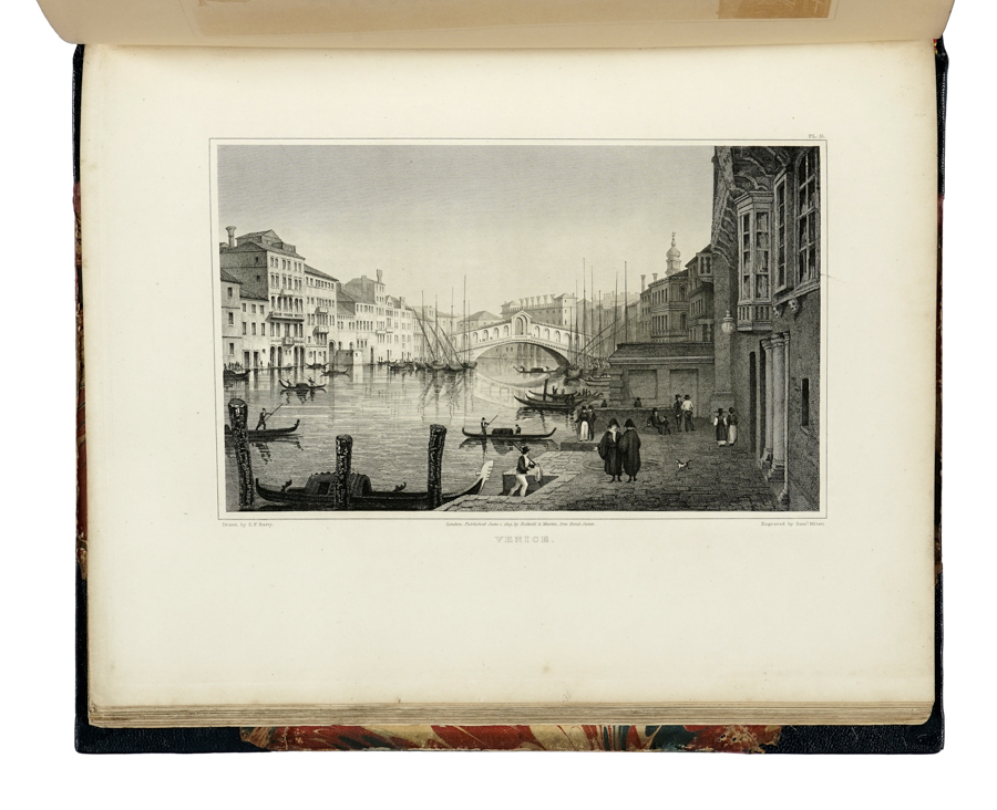 Batty Elizabeth Frances, Italian Scenery from Drawings made in 1817. London: Published by Rodwell & Martin, 1820. In-8° grande (mm 295x230). Pagine [10], 197, [1] con 60 tavole incise in rame fuori testo, tutte protette da velina, tranne una. Graziose vignette al frontespizio inciso e in fine. Bruniture alle veline, marginalmente strappata quella alla carta 24, altrimenti ottimo e fresco esemplare. Legatura coeva in mezza pelle blu, con piatti in carta marmorizzata, fregi e titoli in oro al dorso a 5 nervi, taglio superiore dorato e sguardie in carta marmorizzata. Minime mende. (1)Non comune libro di viaggio. Le incisioni sono tratte dai disegni originali di Elizabeth Batty e raffigurano vedute di città e località italiane. Brunet I, 701; Graesse I, 701; Lowndes VI, 2199. II OPERA: Raccolta di incisioni tratte dalle vedute che il pittore gallese Richard Wilson trasse in gran numero durante il suo soggiorno italiano, da Venezia (dove arrivò nel 1750) a Roma (dove soggiornò fino al 1757).