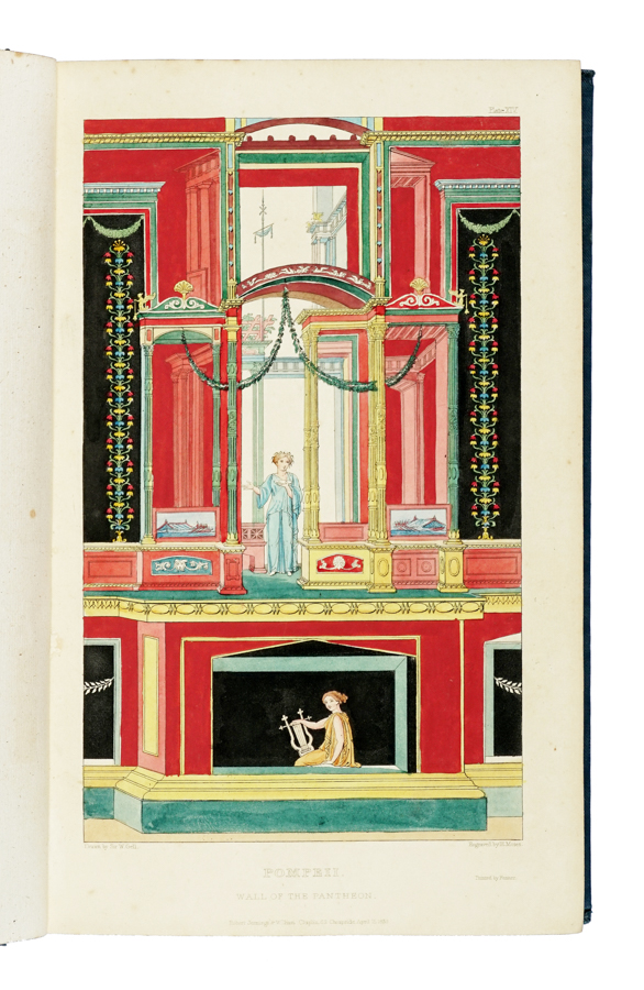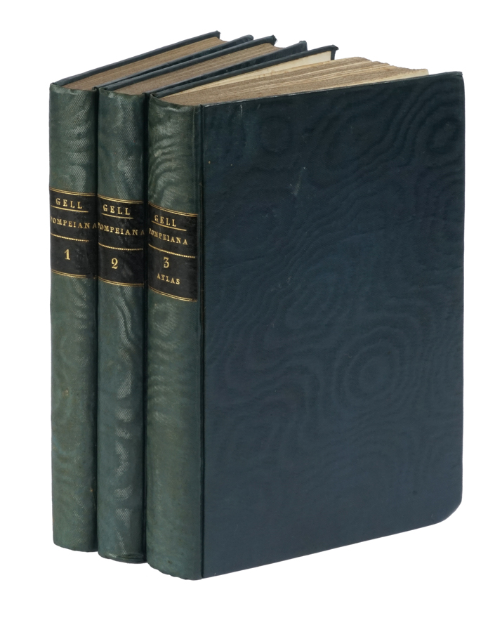 Gell William, Pompeiana: the topography, edifices and ornaments of Pompeii... London: Jennings and Chaplin, 1832. 2 volumi in-8° (mm 235x150). Pagine [8], XXIV, 198, [2]; [4], 207, [1] + 1 volume di atlante dello stesso formato contenente 1 ritratto inciso e 86 [di 88] tavole a piena pagina. Assenti le tavole 37 e 70. Sporadiche fioriture. Legatura moderna in piena tela blu con titolo in oro su tassello al dorso. (3)Prima edizione inglese (la prima è del 1817) di questo interessante trattato archeologico e storico su Pompei corredato di belle illustrazioni: al suo interno figurano riproduzioni di scavi e strade, affreschi, dipinti e alcune planimetrie. Vinet 1724: «planches sont bien exécutées». Cfr. anche Brunet II, 2519.