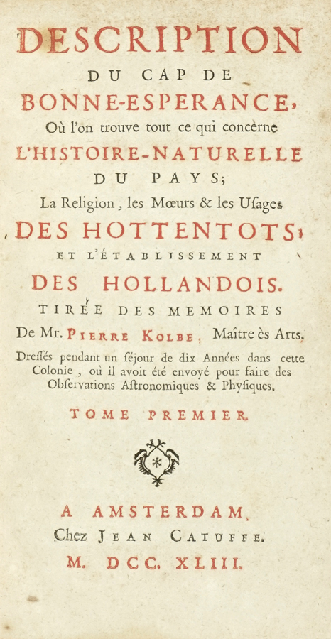 Kolb Peter, Description du Cap de Bonne-Esperance, ou l’on trouve tout ce qui concerne l’histoire-naturelle du pays... Tome premier (-troisieme). A Amsterdam: chez Jean Catuffe, 1742.