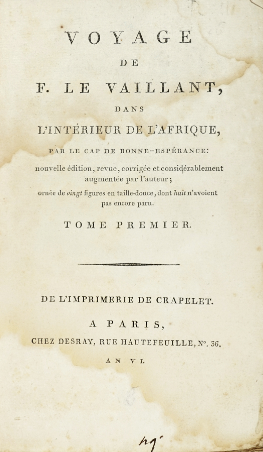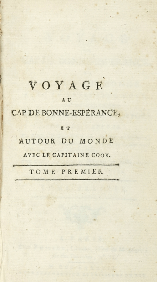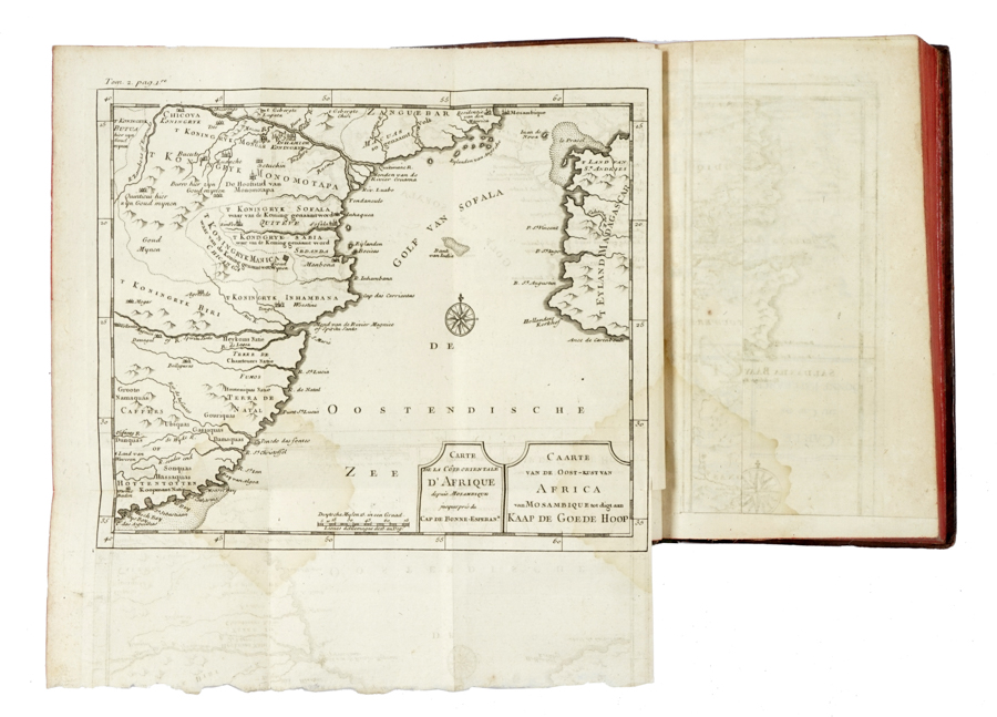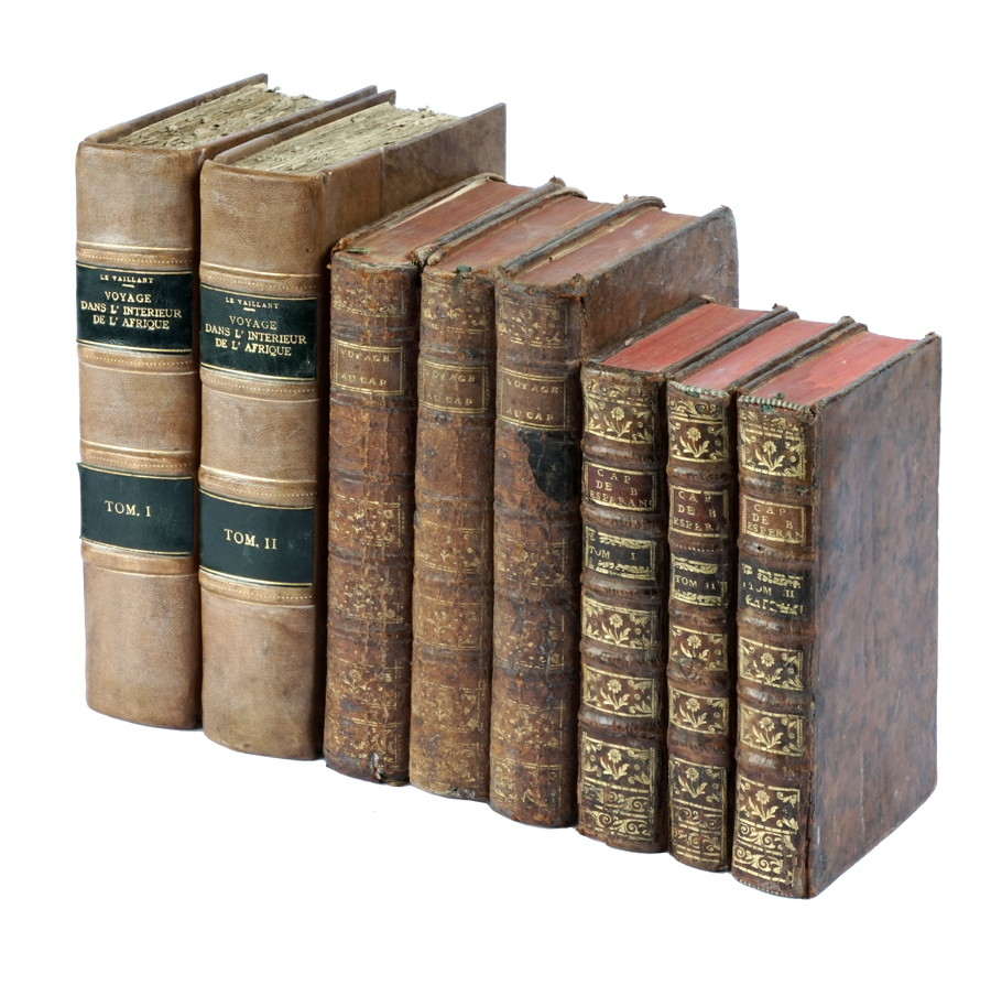 Kolb Peter, Description du Cap de Bonne-Esperance, ou l’on trouve tout ce qui concerne l’histoire-naturelle du pays... Tome premier (-troisieme). A Amsterdam: chez Jean Catuffe, 1742. 3 volumi in-12° (mm 165x93). Pagine [4], XIII, [11], 428 [1], 3 bianche con 8 tavole a piena pagina fuori testo; [16], 262, 2 bianche con 6 tavole ripiegate fuori testo, di cui 5 mappe e 1 veduta di Capo di Buona speranza; [20], 320 con 22 tavole a piena pagina fuori testo. Con, nel complesso, 36 tavole fuori testo. Rare carte gorate, nel complesso buona copia. Legatura coeva in piena pelle con titoli e decorazioni in oro al dorso, tagli rossi e sguardie in carta marmorizzata. Alcune mancanze lungo le cerniere. Ex-libris di precedente proprietario al contropiatto anteriore. SI AGGIUNGONO: Sparmann André, Voyage au Cap de Bonne-Espérance... Tome premier (-troisieme). Paris: Buisson, 1787. 3 volumi in-8°. Levaillant François, Voyage dans l'intérieur de l'Afrique, par le cap de Bonne-Espérance. Tome premier (-seconde). Paris: Desray, [1797]. 2 volumi in-8°. (8)I OPERA: Buona edizione francese impressa ad Amsterdam e realizzata a partire dalla prima, tedesca, del 1719. Peter Kolbe, astronomo e naturalista tedesco, a Città del Capo trascorse 8 anni (dal 1705 al 1712) producendo una dettagliata relazione sul luogo, i suoi abitanti, la flora e la fauna locali.